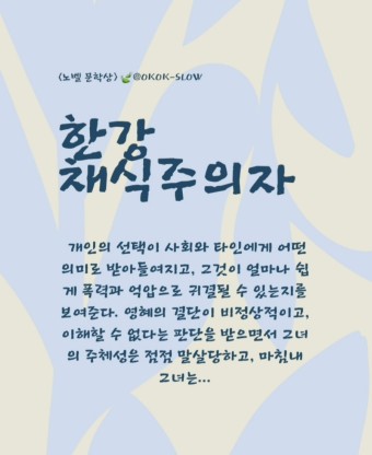 - 영혜의 채식 선언은 단순한 식습관 변화가 아니라, 사회적 규범과 폭력에 저항하는 상징적인 행위입니다.